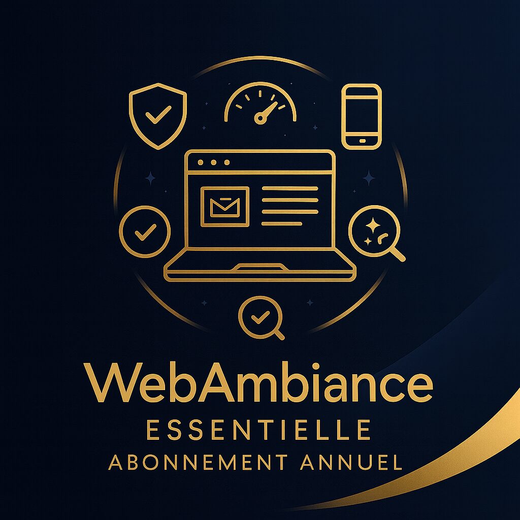 WebAmbiance Essentielle est la formule d’abonnement site vitrine clé-en-main pour un site pro, net et rapide — sans coûts cachés. Pour 600€/an, vous obtenez un site jusqu’à 5 pages designé sur mesure par WebAmbiance (structure, palette, typographies, mise en page), un formulaire de contact complet, une version mobile optimisée et des performances soignées pour un chargement express. Hébergement + certificat SSL inclus : votre domaine est sécurisé en HTTPS dès la mise en ligne. Le socle SEO est préconfiguré (titres, métadonnées, sitemap, indexation) pour être trouvable dès le départ. La formule est évolutive : vous pourrez l’enrichir facilement avec des optionsselon vos besoins, tout en gardant une base fiable, sécurisée et prête à convertir.